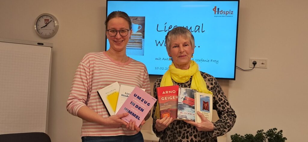 Mit dieser Veranstaltung vom 10. Februar gaben die Hospizbegleiterinnen Antonia Hans und Stefanie Frey durch lebhaftes Vorstellen und Vorlesen Einblicke in Bücher, die sich im engeren und weiteren Sinne mit der Hospizarbeit beschäftigen. Nach Durchsicht zahlreicher Lektüren zum entsprechenden Thema hatten folgende Bücher die Leserinnen besonders begeistert und wurden daher vorgestellt: